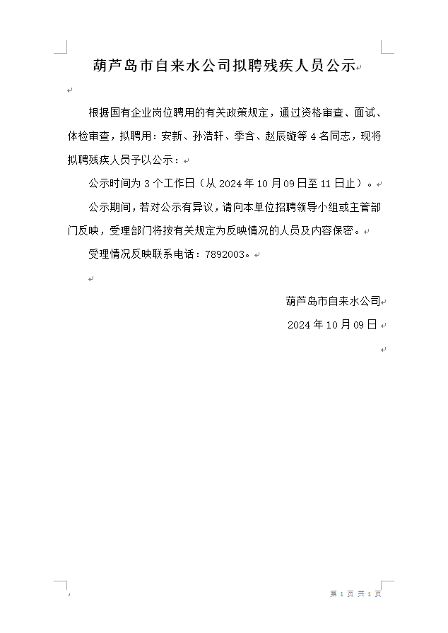 葫蘆島市自來水公司擬聘殘疾人員公示