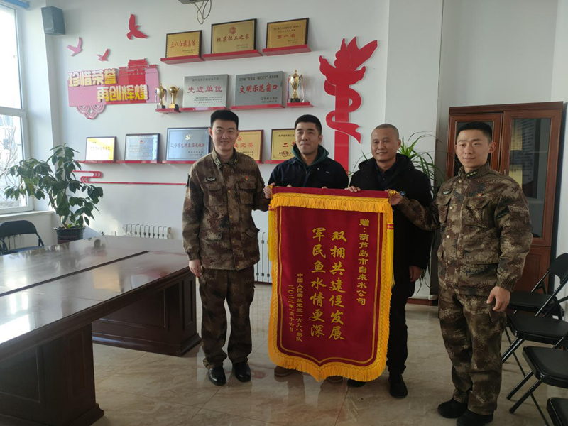 1月28日下午,駐葫某部領導專程來到自來水公司,對自來水公司在保障供水過程中提供的支持和幫助表示感謝,并送來錦旗。