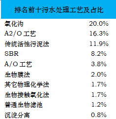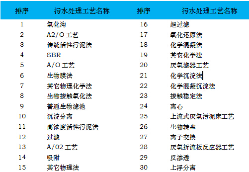 據(jù)不完全統(tǒng)計,全國范圍內(nèi)已建成運營的污水處理廠數(shù)量約4000座,這其中有統(tǒng)計數(shù)據(jù)的污水處理工藝大約30種左右,E20研究院統(tǒng)計各類技術(shù)工藝,排名如下文所示: