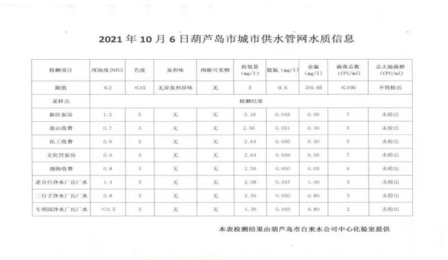 2021年10月6日葫蘆島市城市供水管網(wǎng)水質(zhì)信息