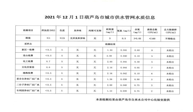 2021年12月1日葫蘆島市城市供水管網(wǎng)水質(zhì)信息
