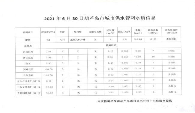 2021年6月30日葫蘆島市城市供水管網(wǎng)水質(zhì)信息