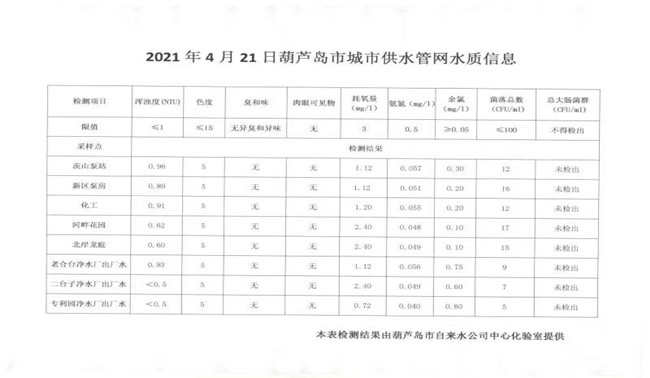2021年4月21日葫蘆島市城市供水管網水質信息