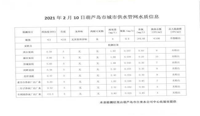 2021年2月10日葫蘆島市城市供水管網(wǎng)水質信息