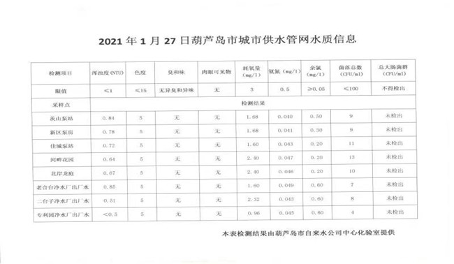 2021年1月27日葫蘆島市城市供水管網(wǎng)水質(zhì)信息