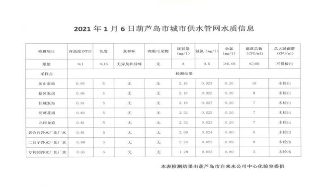 2021年1月6日葫蘆島市城市供水管網(wǎng)水質(zhì)信息