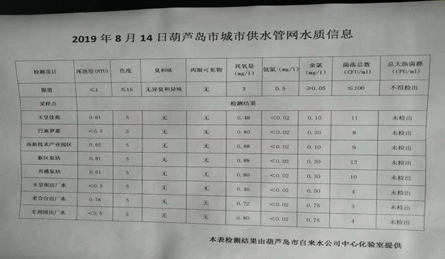 2019年8月14日葫蘆島市城市供水管網(wǎng)水質(zhì)信息