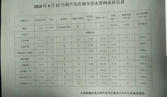 2019年4月17日葫蘆島市城市供水管網(wǎng)水質(zhì)信息