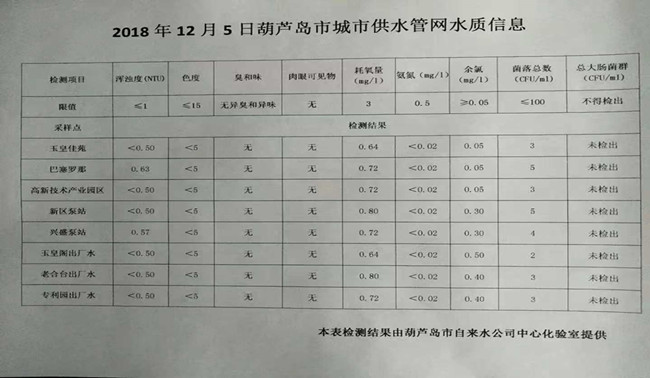 2018年12月05日葫蘆島市城市供水管網(wǎng)水質(zhì)信息