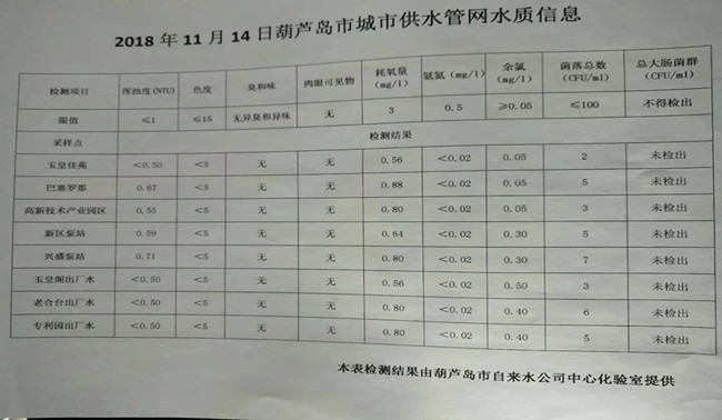 2018年11月14日葫蘆島市城市供水管網(wǎng)水質(zhì)信息