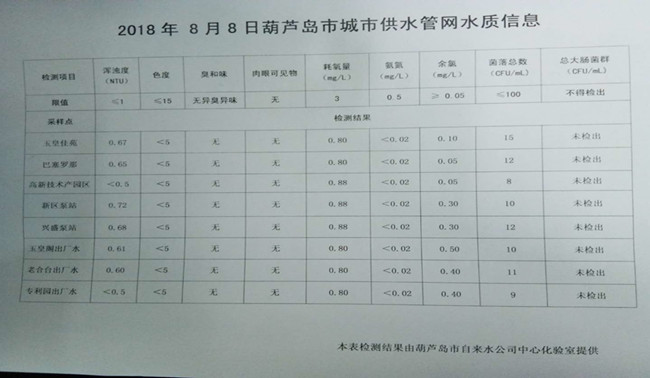 2018年8月8日葫蘆島市城市供水管網(wǎng)水質(zhì)信息