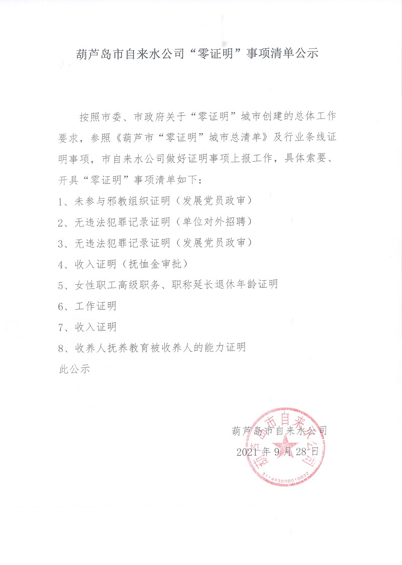 葫蘆島市自來(lái)水公司“零證明”事項(xiàng)清單公示