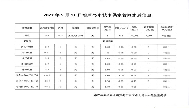 2022年5月11日葫蘆島市城市供水管網(wǎng)水質(zhì)信息