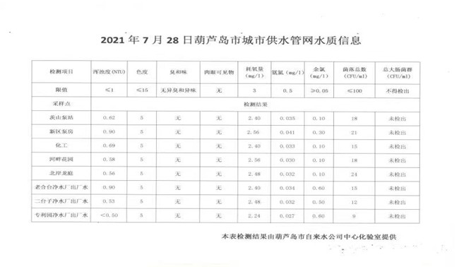 2021年7月28日葫蘆島市城市供水管網(wǎng)水質(zhì)信息