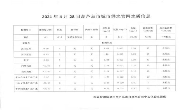 2021年4月28日葫蘆島市城市供水管網(wǎng)水質(zhì)信息