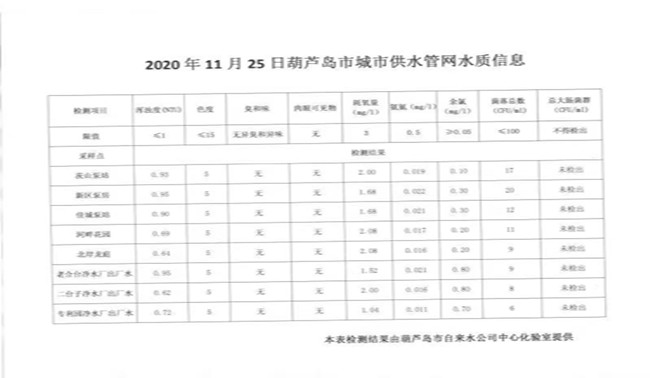 2020年11月25日葫蘆島市城市供水管網(wǎng)水質(zhì)信息