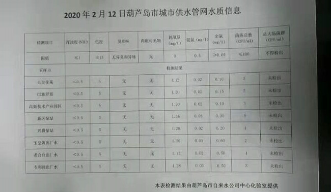2020年2月12日葫蘆島市城市供水管網(wǎng)水質(zhì)信息