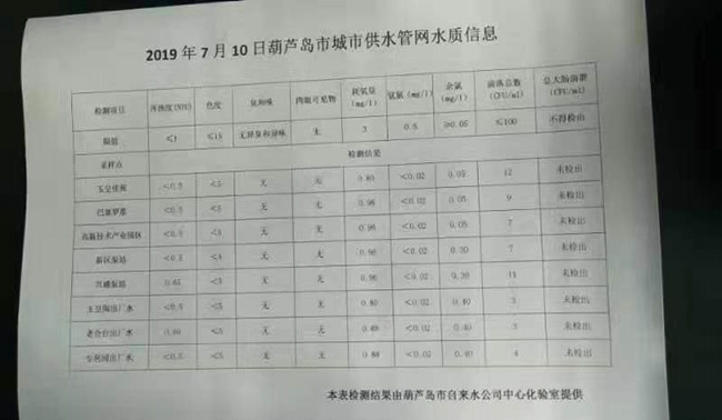 2019年7月10日葫蘆島市城市供水管網(wǎng)水質(zhì)信息