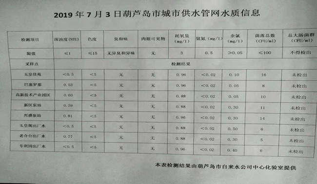 2019年7月3日葫蘆島市城市供水管網(wǎng)水質(zhì)信息