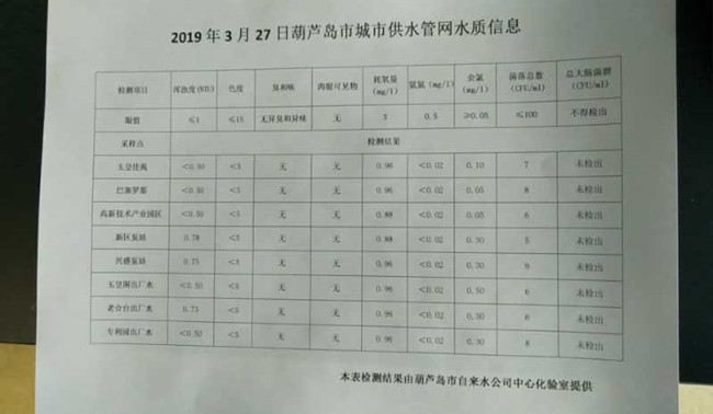 2019年3月27日葫蘆島市城市供水管網(wǎng)水質(zhì)信息