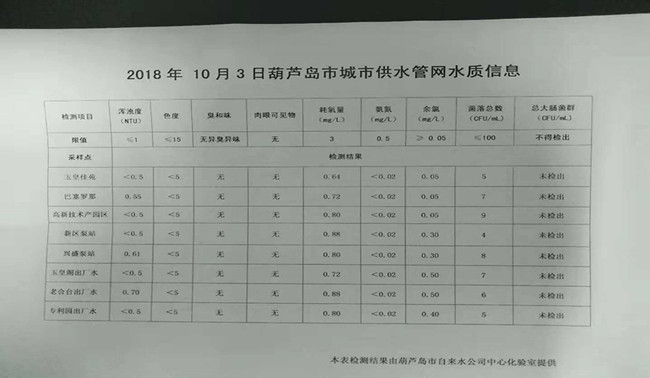 2018年10月3日葫蘆島市城市供水管網(wǎng)水質(zhì)信息