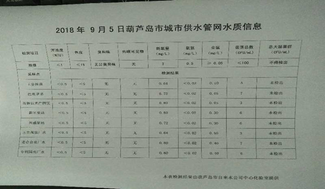 2018年9月5日葫蘆島市城市供水管網(wǎng)水質(zhì)信息