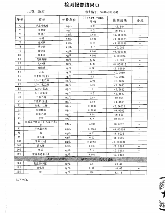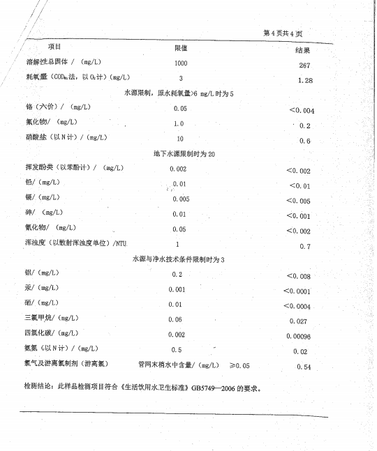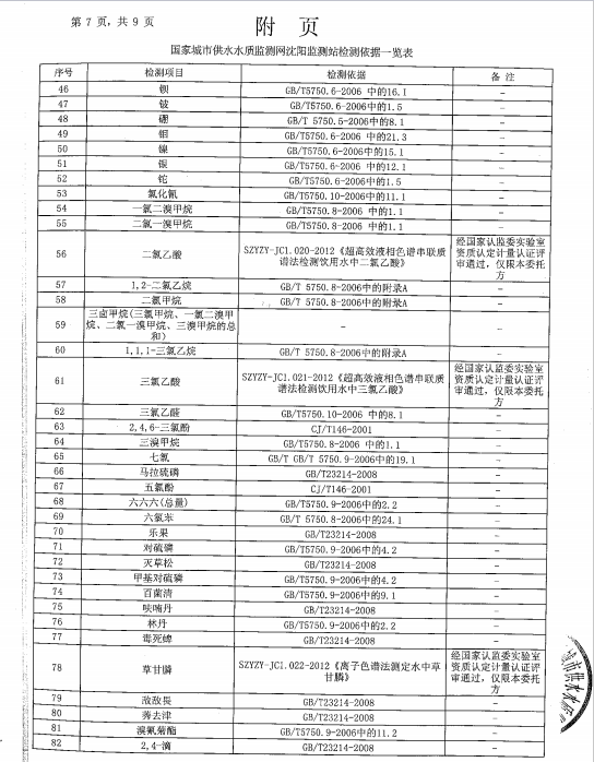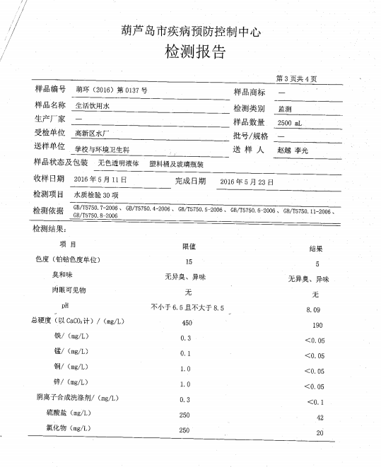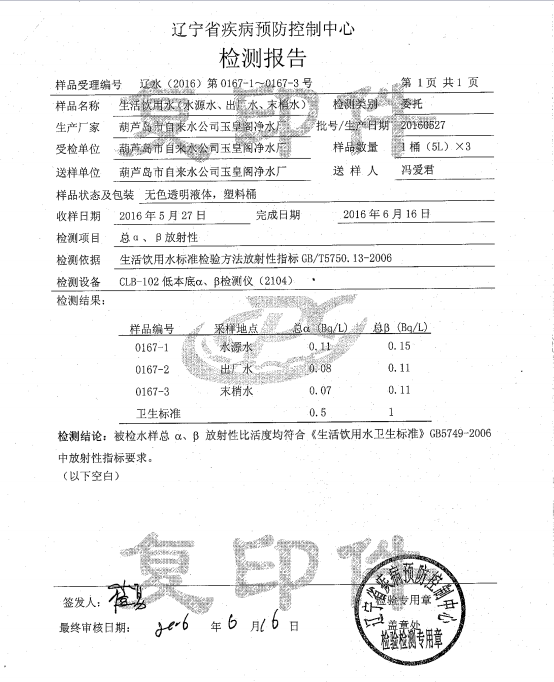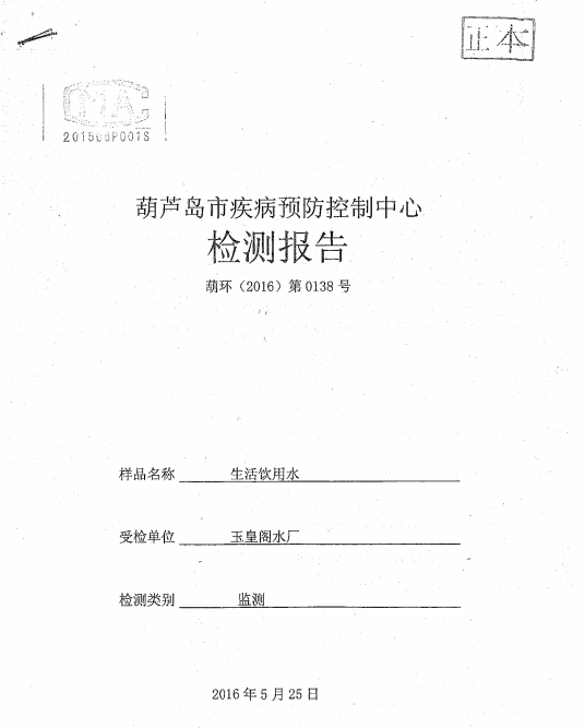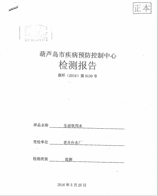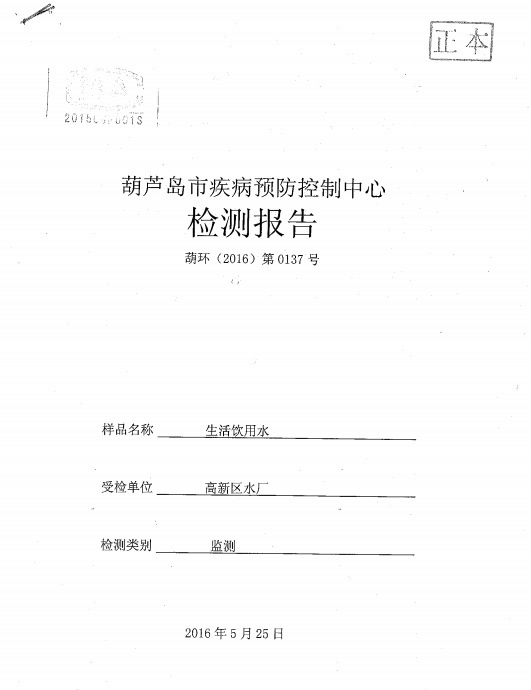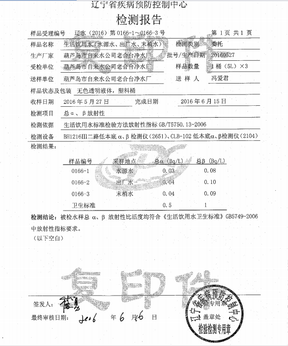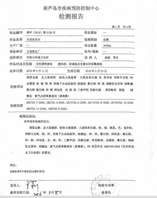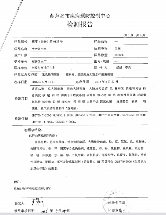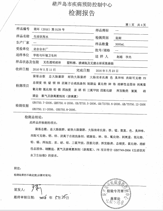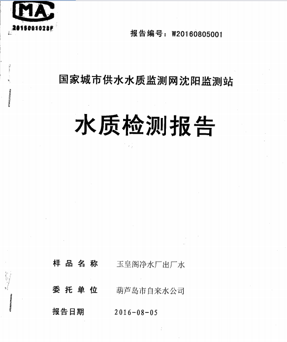 葫蘆島市自來水公司2016年水質(zhì)檢測報告公示