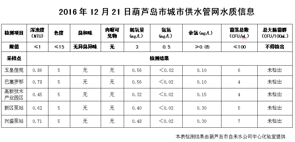 2016年12月21日葫蘆島市城市供水管網(wǎng)水質(zhì)信息